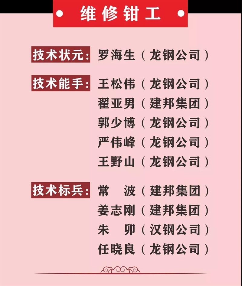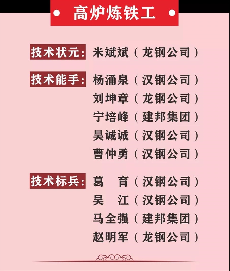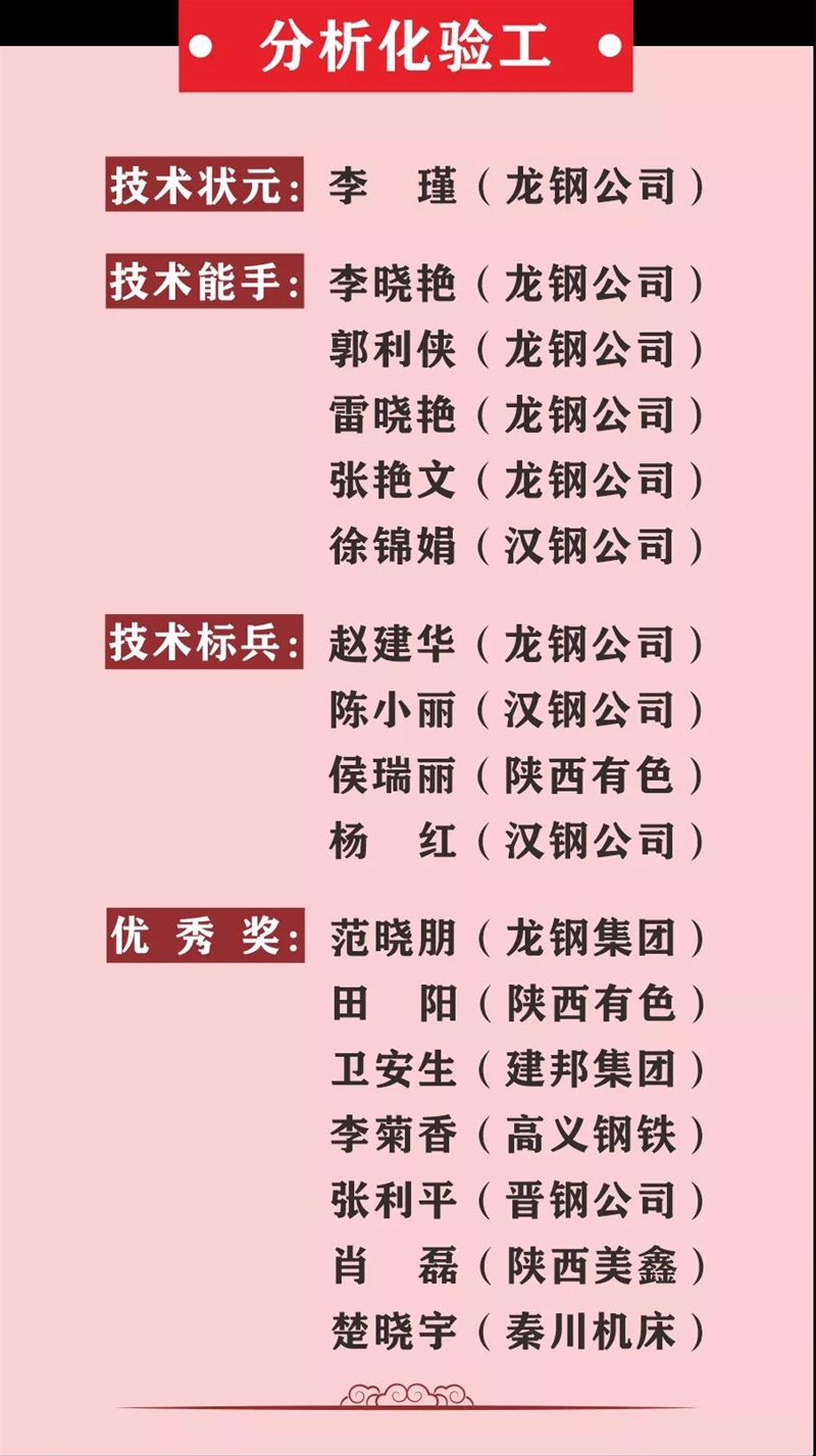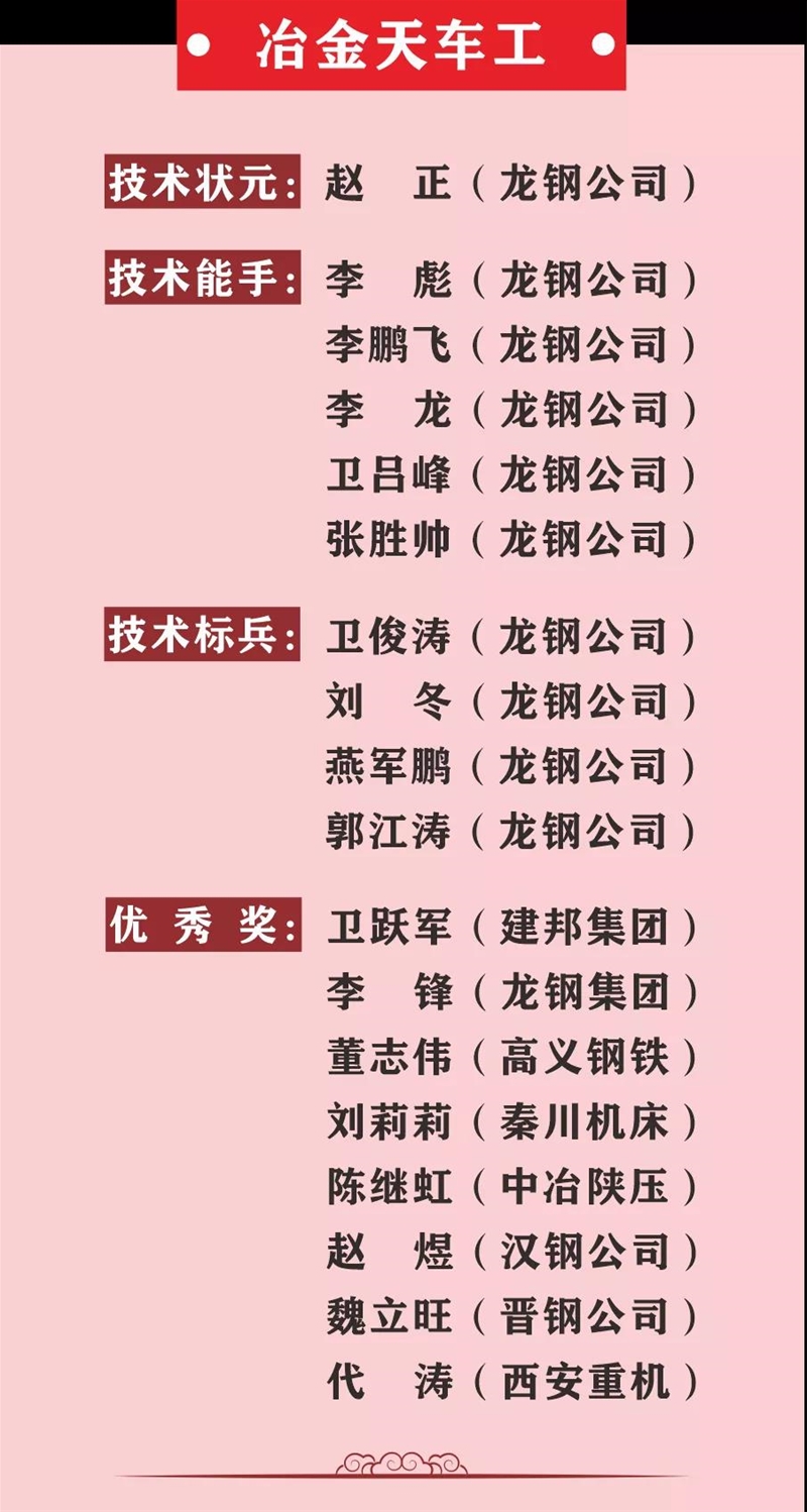 薛繼虎宣布表彰決定。本次競賽,來自陜西省機械冶金建材系統11家參賽單位以及西北聯鋼3家山西鋼鐵企業(yè)的137名參賽選手,經過3天的激烈角逐,最終在高爐煉鐵工、冶金天車工、分析化驗工、維修鉗工4個工種競賽中產生了陜西省機冶建材系統“技術狀元”4名、“技術能手”20名、 “技術標兵”16名,其中分析化驗工和冶金天車工兩個工種競賽還產生了“優(yōu)秀獎”15名,并在閉幕式進行表彰頒獎,還表彰了優(yōu)秀組織單位和優(yōu)秀組織個人。對獲得本次大賽高爐煉鐵工、冶金天車工前3名的選手將由組委會推薦省有關單位授予“陜西省技術能手”稱號。