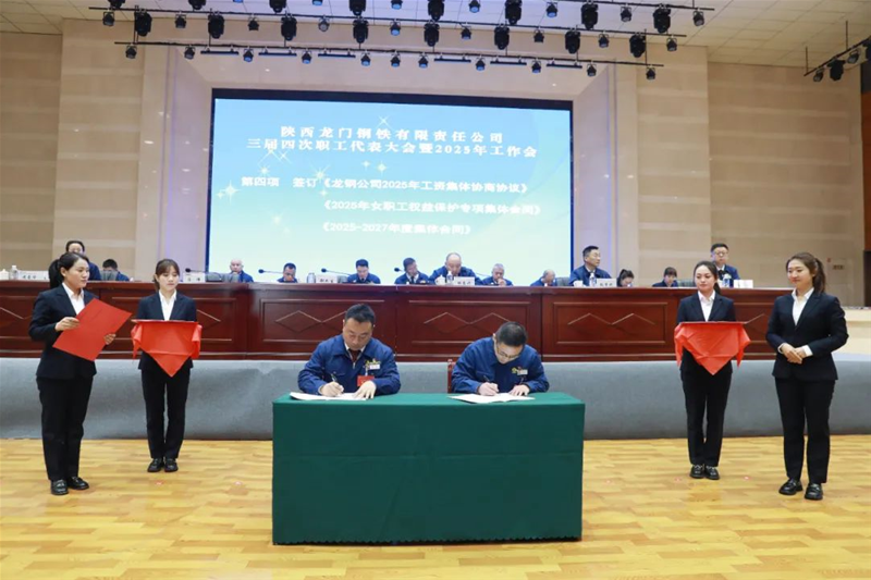 會(huì)上簽訂了《龍鋼公司2025年工資集體協(xié)商協(xié)議》《2025年女職工權(quán)益保護(hù)專項(xiàng)集體合同》《2025—2027年度集體合同》《2025年經(jīng)營(yíng)目標(biāo)責(zé)任書(shū)》《2025年安全環(huán)保目標(biāo)責(zé)任書(shū)》。