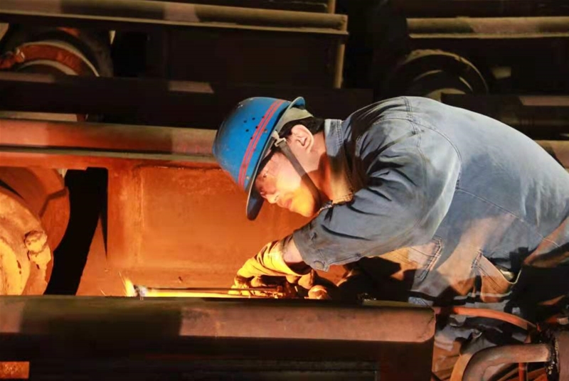 在3#轉(zhuǎn)爐爐下渣道,當(dāng)爐渣的余熱還充盈在爐下每一處時,更換爐下軌道的檢修作業(yè)已經(jīng)開始了。維修班長徐永斌正帶著幾位工友在拆卸渣道軌道上的連接板,由于連接板螺栓上得緊,特別難拆,幾個人用專用工具,卡在螺栓上,咬緊牙關(guān),一毫米一毫米地拆卸著。在渣道的另一頭,維修主管趙雷和安全員高明生帶領(lǐng)人員正將新軌道一米一米抬過去。遠(yuǎn)遠(yuǎn)望去,那些“紅、黃、藍(lán)”分工協(xié)作,配合得天衣無縫。他們一個個臉上掛滿了汗珠,忍受著炙烤,但他們無暇理會這些,他們時刻在想著,在安全的保證下,一定要高效完成檢修任務(wù),交上一份滿意答卷。