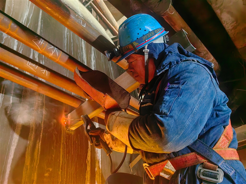 跟隨著張軍喜來到爐頂74米平臺處,只見維修班班長薛聰正全神貫注地修整管道切口,確保嚴(yán)絲合縫。爐頂?shù)暮L(fēng)從領(lǐng)口、袖口鉆進(jìn)身體里,讓人禁不住打顫……“時(shí)間緊、任務(wù)重,我得抓緊時(shí)間!”薛聰堅(jiān)毅的目光緊盯氣割槍頭處……