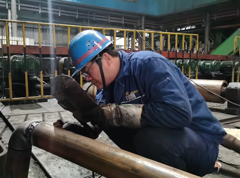 走進(jìn)軋鋼工序板帶作業(yè)區(qū)卷曲下料處檢修現(xiàn)場,鏗鏘敲擊聲、焊花四濺。鉗工馬龍頭戴安全帽,目光如炬,正在焊接下料平臺架子,周圍的冷空氣360度無死角彌漫,他全然不顧,忙得不亦樂乎。