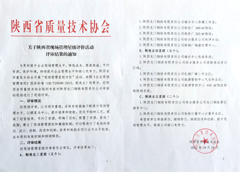 龍鋼公司深入推進現(xiàn)場管理星級達標工作,認真策劃部署,常態(tài)化開展6S考評、六個一、對標交流、“六個百分之百”活動,按照“零容忍、無死角、全覆蓋”要求,圍繞環(huán)保攻堅過程、生產實際和文明施工中存在問題,相互對標、系統(tǒng)治理,持續(xù)鞏固,實現(xiàn)現(xiàn)場管理共同提升。模擬開展林業(yè)碳匯造林項目,傳播綠色低碳生態(tài)理念,將產業(yè)結構與生態(tài)經濟相結合,大力開展植樹造林,增加綠地面積,提高綠化覆蓋率,落實綠化專業(yè)管護,加強綠化養(yǎng)護精細管理,保障苗木茁壯生長,提升綠化效果。2022年,經陜西省質量技術協(xié)會現(xiàn)場星級評價,龍鋼榮獲省級星級現(xiàn)場12個(五星級2個,四星級5個,三星級5個),成為陜西省榮獲星級現(xiàn)場最多的企業(yè),并榮獲“省級園林式單位”稱號。