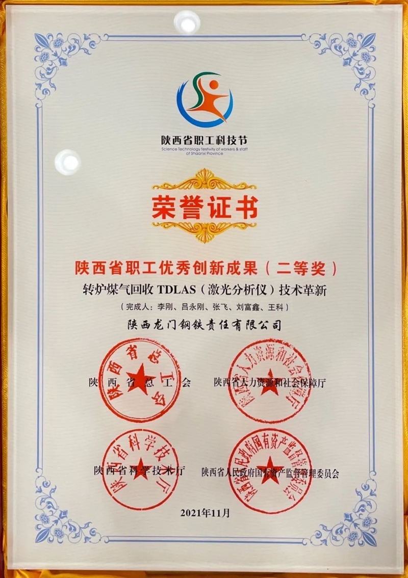 李剛、呂永剛、張飛、劉富鑫、王科聯(lián)合完成的創(chuàng)新項(xiàng)目《轉(zhuǎn)爐煤氣回收 TDLAS(激光分析儀)技術(shù)革新》榮獲陜西省第六屆職工科技節(jié)優(yōu)秀科技創(chuàng)新成果二等獎(jiǎng)
