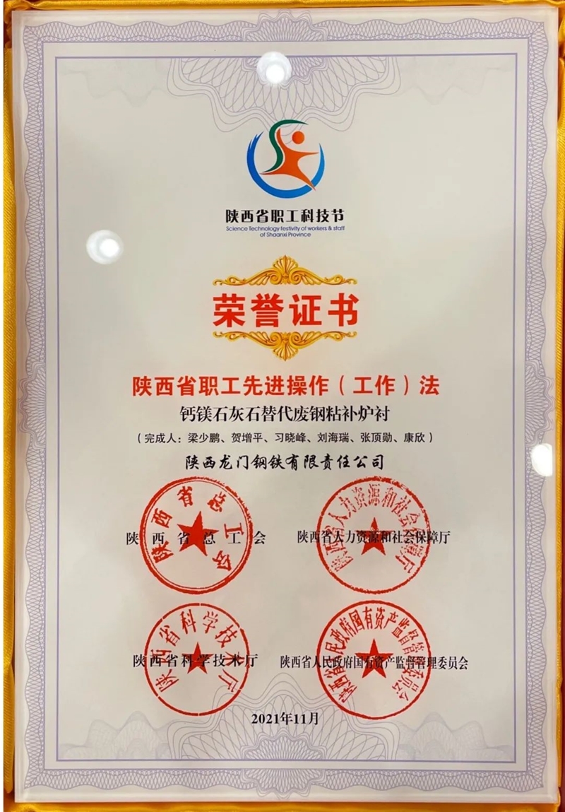 梁少鵬、賀增平、習(xí)曉峰、劉海瑞、張頂勛、康欣聯(lián)合完成的創(chuàng)新項(xiàng)目《鈣鎂石灰石替代廢鋼粘補(bǔ)爐襯》榮獲陜西省第六屆職工科技節(jié)陜西省職工先進(jìn)操作(工作)法榮譽(yù)稱號(hào)。
