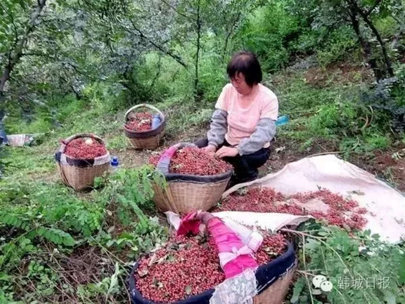 中午的太陽(yáng)越發(fā)的熱,悶熱的空氣熱得摘椒人直冒汗,麻辣的花椒汁液滲進(jìn)皮膚,花椒刺劃破的地方火辣辣地疼。我漸漸敗下陣來(lái),蹲在地隴旁邊休息??粗切﹣?lái)自四面八方,說(shuō)著不同口音的花椒客邊說(shuō)邊笑,手下麻利地采摘,想想她們可真堅(jiān)強(qiáng)。二嫂頭發(fā)上裹著一條濕毛巾,手指上下翻飛,一會(huì)探出上半身夠樹(shù)上邊的枝條,一會(huì)彎腰,劈開(kāi)花椒樹(shù)下邊細(xì)碎繁密的毛刺,順便還用鐮刀修剪一下那些樹(shù)干上冒出的嫩芽。聽(tīng)二嫂說(shuō):八月份,是家鄉(xiāng)豐收的季節(jié),這兩個(gè)月要手腳麻利,不能讓花椒熟過(guò)了,落地上了可惜。今年雨水好,花椒結(jié)的果多,三斤半濕花椒就能曬成一斤干花椒,花椒價(jià)格比過(guò)去翻了幾番,孩子們上學(xué)的學(xué)費(fèi),家里的開(kāi)支全靠著花椒。原來(lái),在家鄉(xiāng)村民心中,花椒就是他們的衣食父母,只要勤勞就能致富。