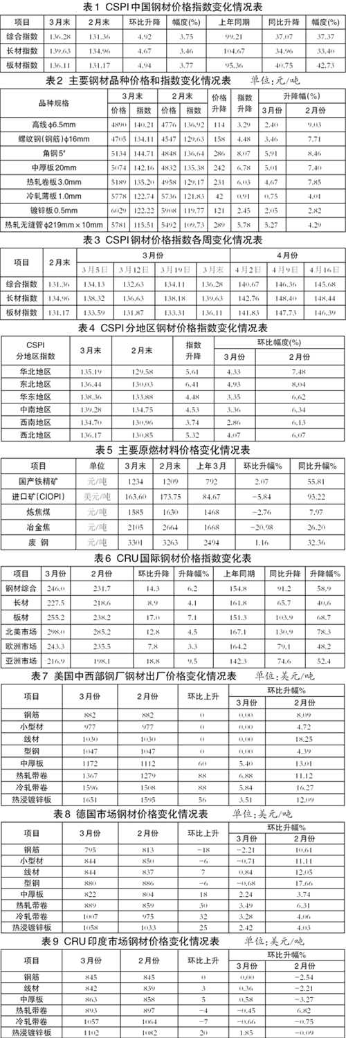 3月份,國內(nèi)市場需求旺盛,鋼材價格波動上行,升幅較2月份有所加大。進入4月份以來,鋼材價格先升后降,總體延續(xù)波動上行走勢。