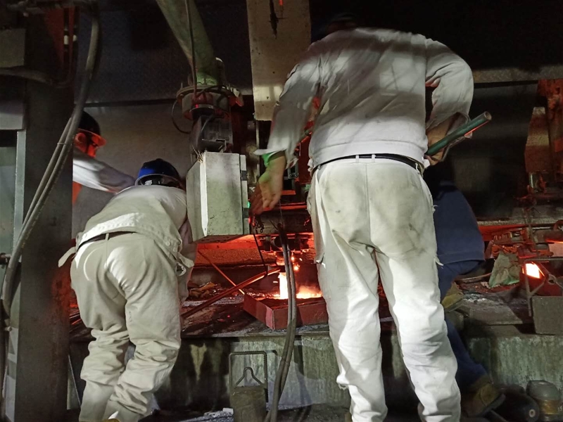 爭(zhēng)分奪秒搶時(shí)間。換包不僅要追求穩(wěn)定順行,更要追求速度快,短時(shí)間內(nèi)順利完成換包,是一件非常自豪的事。接到主控室發(fā)出的“下爐開始換包”指令后,大包工緊盯鋼水液面,其余人員全部在現(xiàn)場(chǎng)待命。待大包澆完關(guān)包后,班組長(zhǎng)拿著油缸,沖到鋼流前,一個(gè)接著一個(gè),嫻熟地進(jìn)行堵流,中包工立即將拉速回零,下套管和連接棒,然后迅速填補(bǔ)冷料。此時(shí)的主控工全神貫注,眼睛不僅要盯著平臺(tái)上的作業(yè),還要隨時(shí)用話筒傳播著信息,手下更是不能出錯(cuò),認(rèn)真操作著電腦關(guān)停二冷水。堵流結(jié)束后,按照班長(zhǎng)的分工,有的指揮天車退包,有的開走中包車,有的鉆進(jìn)二冷室檢查鋼坯狀況,有的量定尺,有的檢查水壓力,有的割尾坯,整個(gè)生產(chǎn)場(chǎng)面就像要迎來一場(chǎng)大型戰(zhàn)役一樣,大家都是跑著搶著干活,沒有一個(gè)閑人。