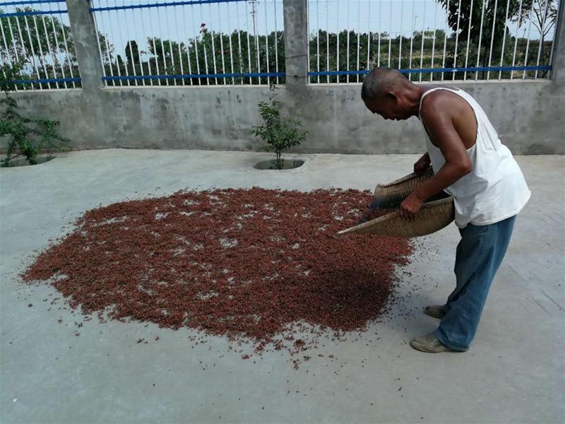 中午吃飯的時(shí)候,爺爺就不見(jiàn)了,只聽(tīng)見(jiàn)院子里“嚓嚓嚓”的聲音,隨即我來(lái)到院子里看見(jiàn)爺爺在收花椒,摸了摸花椒還沒(méi)干就問(wèn)爺爺:“爺爺,花椒還沒(méi)曬干怎么就收了。”爺爺說(shuō)道:“這曬花椒不能曬的太干了,太干了花椒就碎了,不好脫籽”說(shuō)著爺爺已經(jīng)將花椒掃成一堆,用木扒將花椒輕輕地拍打,使花椒籽從花椒上脫離出來(lái),隨后將大部分花椒用木扒扒出來(lái)晾曬,剩下的花椒和籽混在一起不好分離,這時(shí)候爺爺就用簸箕將花椒和籽用他的多年技術(shù)給分離出來(lái)??粗鵂敔敻傻暮貌粺狒[我也試著干了一會(huì),發(fā)現(xiàn)花椒粒沒(méi)有從花椒籽里分出來(lái),它們還是混在一起,看來(lái)這個(gè)活還得慢慢積累經(jīng)驗(yàn)。
