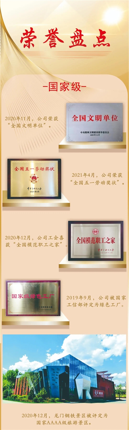 榮譽盤點是邁向美好未來的一次能量積蓄,新時代是奮斗者的時代。讓我們初心不改,砥礪前行,全身心投入到落實集團“2.26”黨委(擴大)會議精神上來,集中精力辦好自己的事,干群同心奮戰(zhàn)“雙目標(biāo)”、夯實“雙掛鉤”、嚴格“四類層”,始終牢記“感恩、知責(zé)、律己、有為”八字要求,扎實踐行“黨建領(lǐng)航、班子引領(lǐng)、干部走在前列”工作機制,扛死肩、硬負責(zé),以龍鋼人的擔(dān)當(dāng)和使命,譜寫更加輝煌的新篇章。