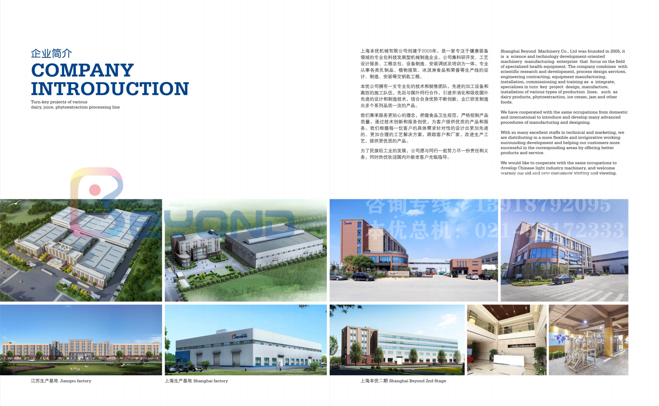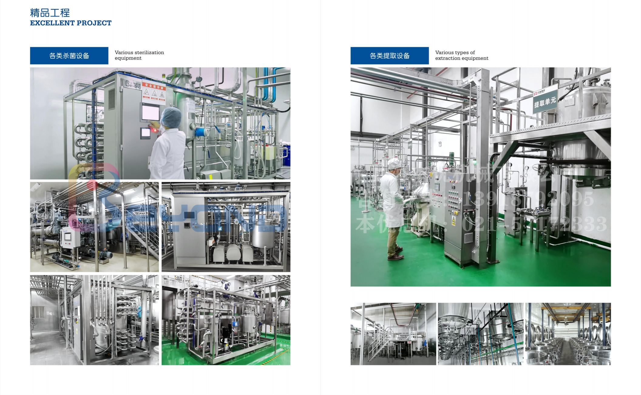 Engaged in turnkey projects such as fruit and vegetable pretreatment, dairy products, beverages, jam, purified water, meat and bone processing, egg processing, pet food, special medical food, wine processing, as well as the design, manufacturing and installation of production lines such as biopharmaceutical and fine chemical industry.