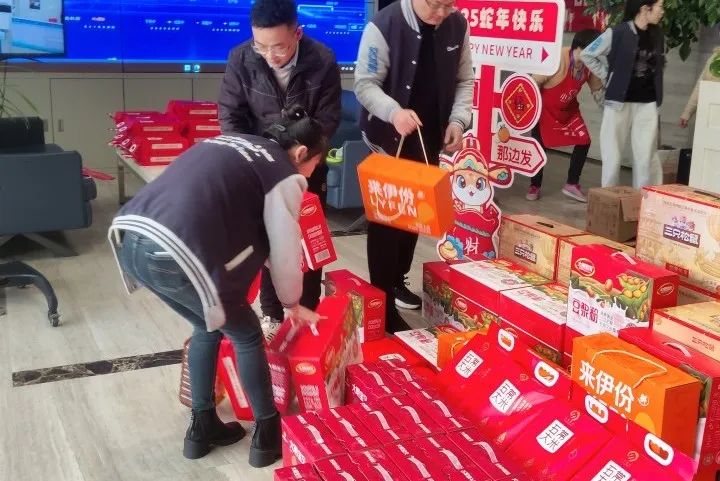 各部門員工紛紛前來領(lǐng)取新年伴手禮,一箱箱暖心的禮品正有序地發(fā)放到員工手中,現(xiàn)場氣氛熱烈,沉甸甸的禮品捧在手里,笑在臉上,暖在心頭,員工們的幸福之情溢于言表。