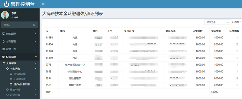 據(jù)悉,自從大病幫扶工作在智慧工會平臺運(yùn)用和管理后,打破了傳統(tǒng)EXCEL花名冊增減臺賬管理的缺陷,規(guī)避了人為操作失誤風(fēng)險(xiǎn)、堵塞了管理漏洞、方便了財(cái)務(wù)核對,極大地提高了工作效率,實(shí)現(xiàn)了讓數(shù)據(jù)多跑路,職工少跑腿,切實(shí)為職工服務(wù)的目標(biāo)。截至目前,退休、辭職人員已辦理退會手續(xù)21人,已享受大病醫(yī)療幫扶政策24人。